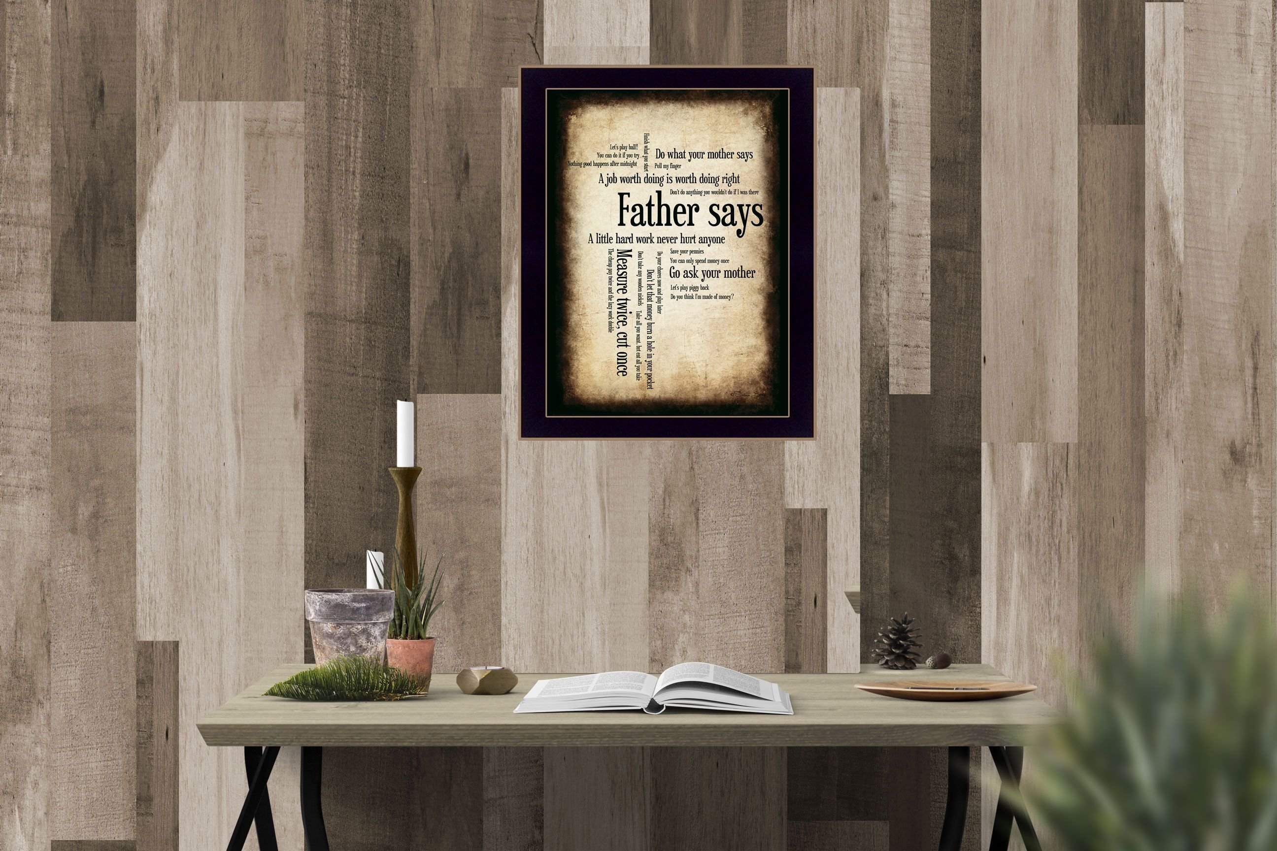 "Father Says" is a 10" x 14" framed script print. This artwork features the words a father might say to his child-"go ask your mother", do what your mother says", etc., by artist Susan Ball. This totally American Made wall decor item features an attractive frame, a textured canvas like finish so no glass is necessary and is ready to hang.•Women Owned (WBE)•Textured Artwork with a 'rolled on' acid free acrylic coating to create a canvas painting effect. No glass is necessary.•UV protectant coating protects artwork from fading.•MDF moulding adds natural beauty to the framed art. Frame is keyholed for ease of hanging.