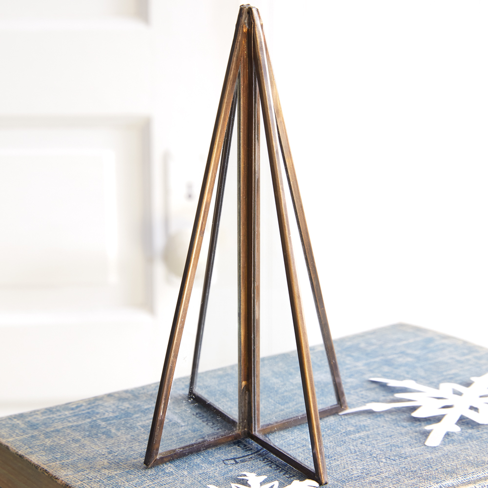 Elegant and minimal, these Christmas trees will dress up a table for the holidays. They feature sleek and modern brass edges and glass panels. Smallest tree measures 4'' dia. x 7''H.